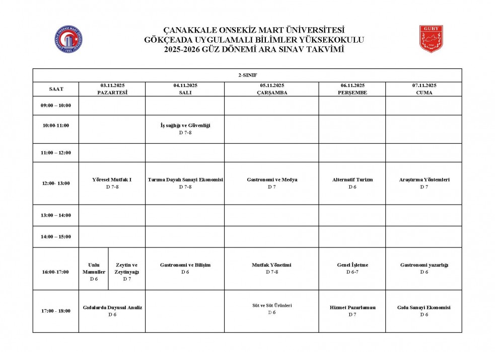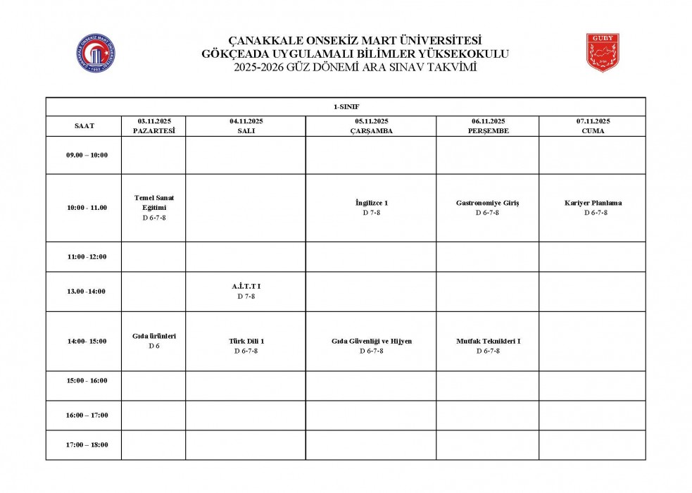 2025-2026 Eğitim Öğretim Yılı Güz Yarıyılı Ara sınav Takvimi