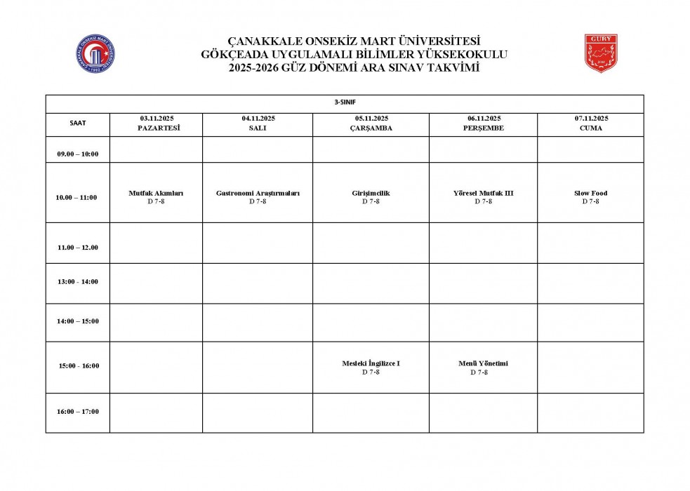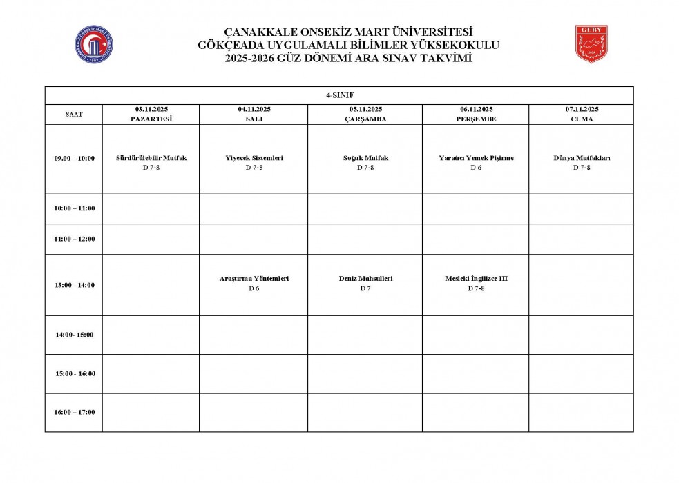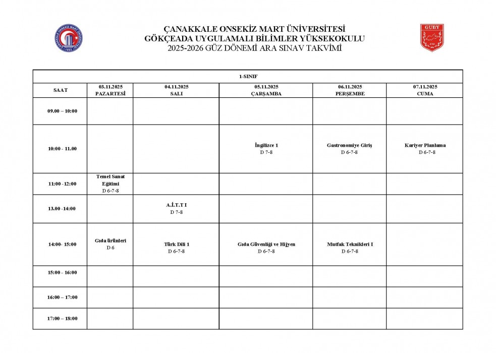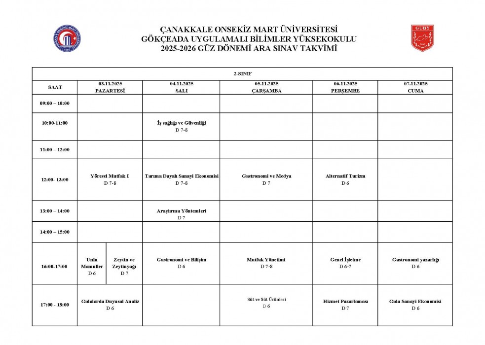 2025-2026 Eğitim Öğretim Yılı Güz Yarıyılı Ara Sınav Takvimi
