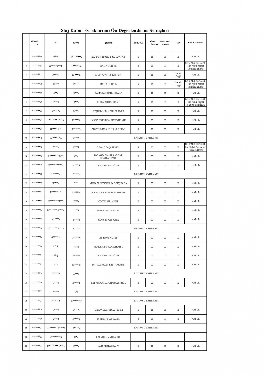 Staj Kabul Evraklarının Ön Değerlendirme Sonuçları