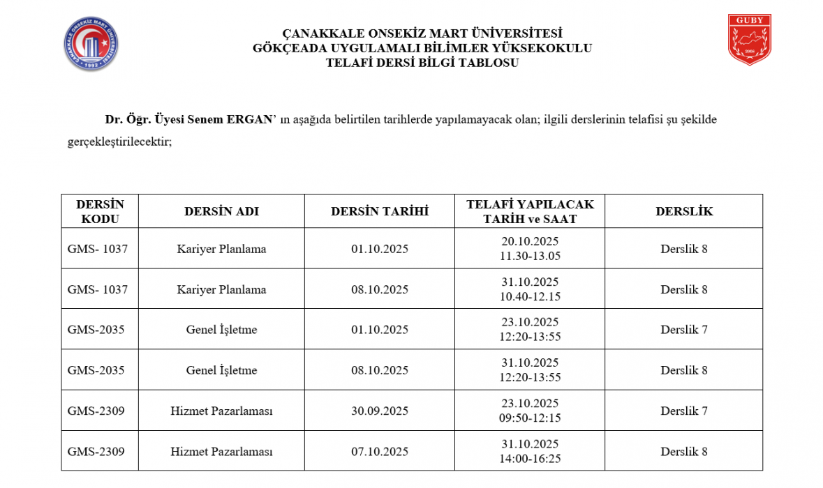 Telafi Dersi Bilgi Tablosu