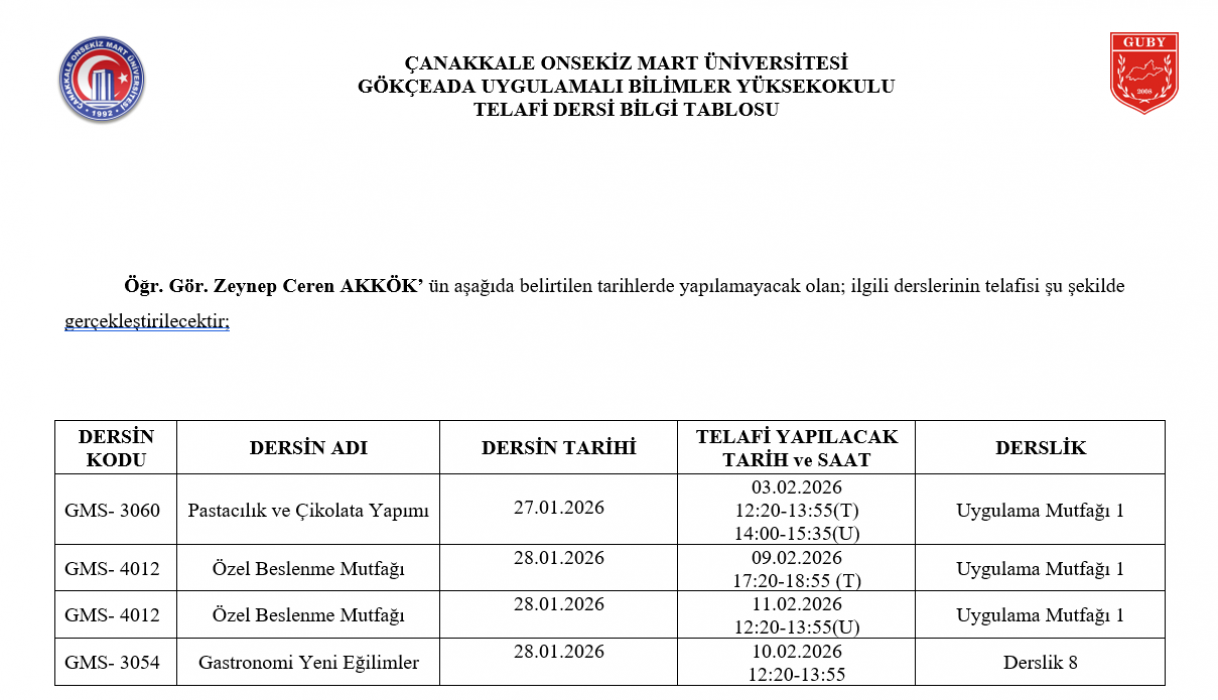 2025-2026 Eğitim-Öğretim Yılı Bahar Yarıyılı Gastronomi ve Mutfak Sanatları Bölümü Ders Programı