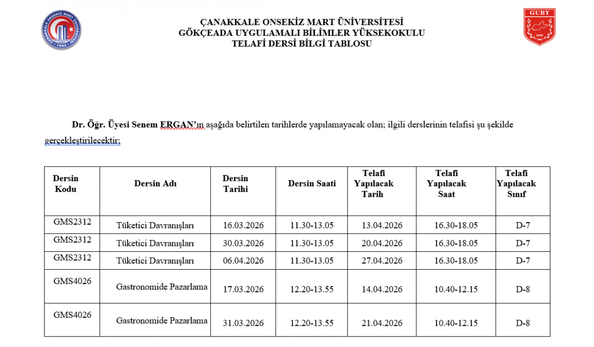 2025-2026 Eğitim-Öğretim Yılı Bahar Dönemi GMS Bölümü Ara Sınav Programı