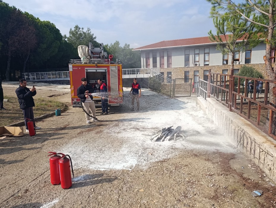 Eğitimin ardından, kontrollü şekilde yakılan ateş, yangın söndürme tüpleri ve itfaiye aracı kullanılarak söndürüldü. Söndürme uygulamasına her iki yüksekokuldan personel ve öğrenciler de aktif olarak katılım sağladı.