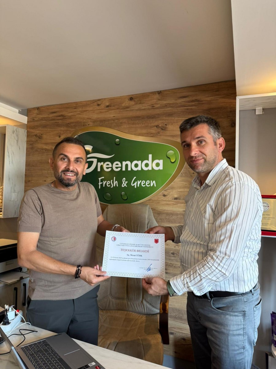 Gökçeada Uygulamalı Bilimler Yüksekokulu Gastronomi ve Mutfak Sanatları Bölümü GastroAntalya 2025 ekibi, dış paydaşlarımızdan Greenada ve Emtar Gıda Tarım Ürünleri’nin sahibi Mesut Türk’e gerçekleştirilen ziyaret kapsamında teşekkür belgesi takdim etti. Belge, yarışma sürecine sağladığı katkılar dolayısıyla GUBY Müdür Yardımcısı Öğr. Gör. Özkan Yazar tarafından sunuldu.