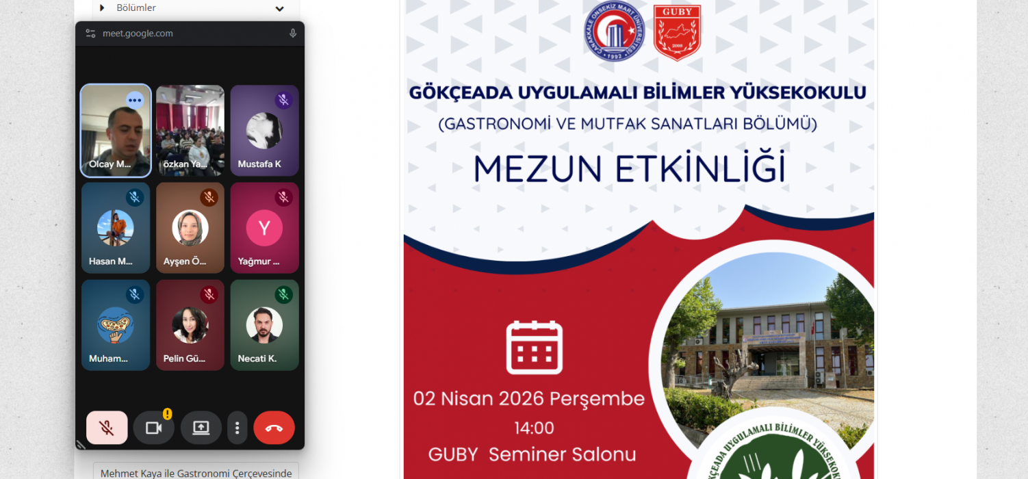 Gökçeada Uygulamalı Bilimler Yüksekokulu Gastronomi ve Mutfak Sanatları Bölümü tarafından düzenlenen Mezun Etkinliği, 02 Nisan 2026 Perşembe günü saat 14.00'te GUBY Seminer Salonu ve çevrimiçi platformda eş zamanlı olarak gerçekleştirildi.