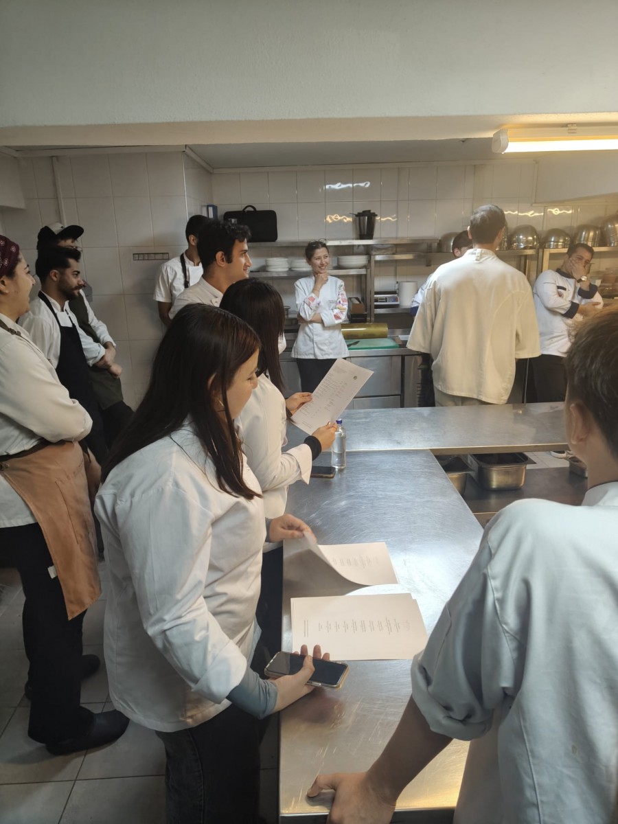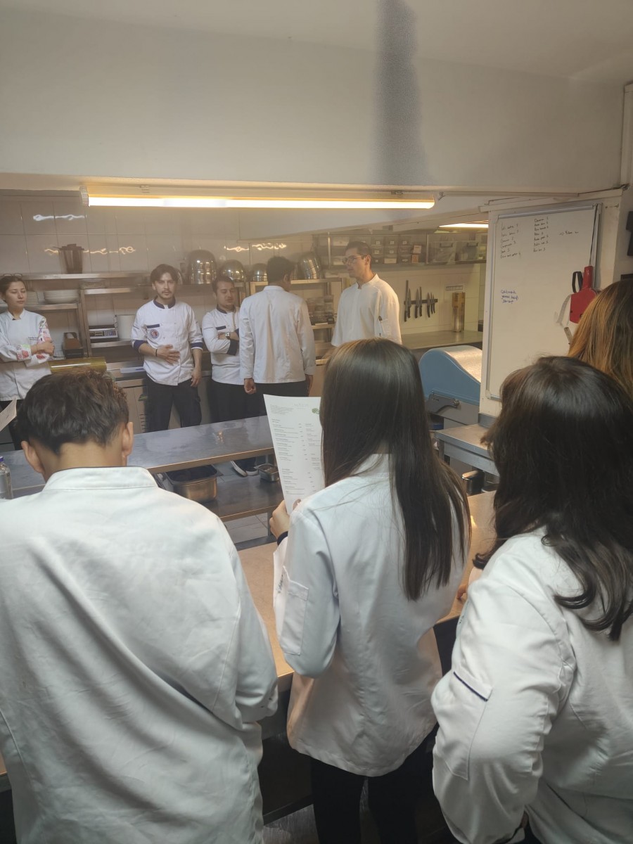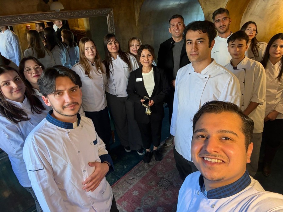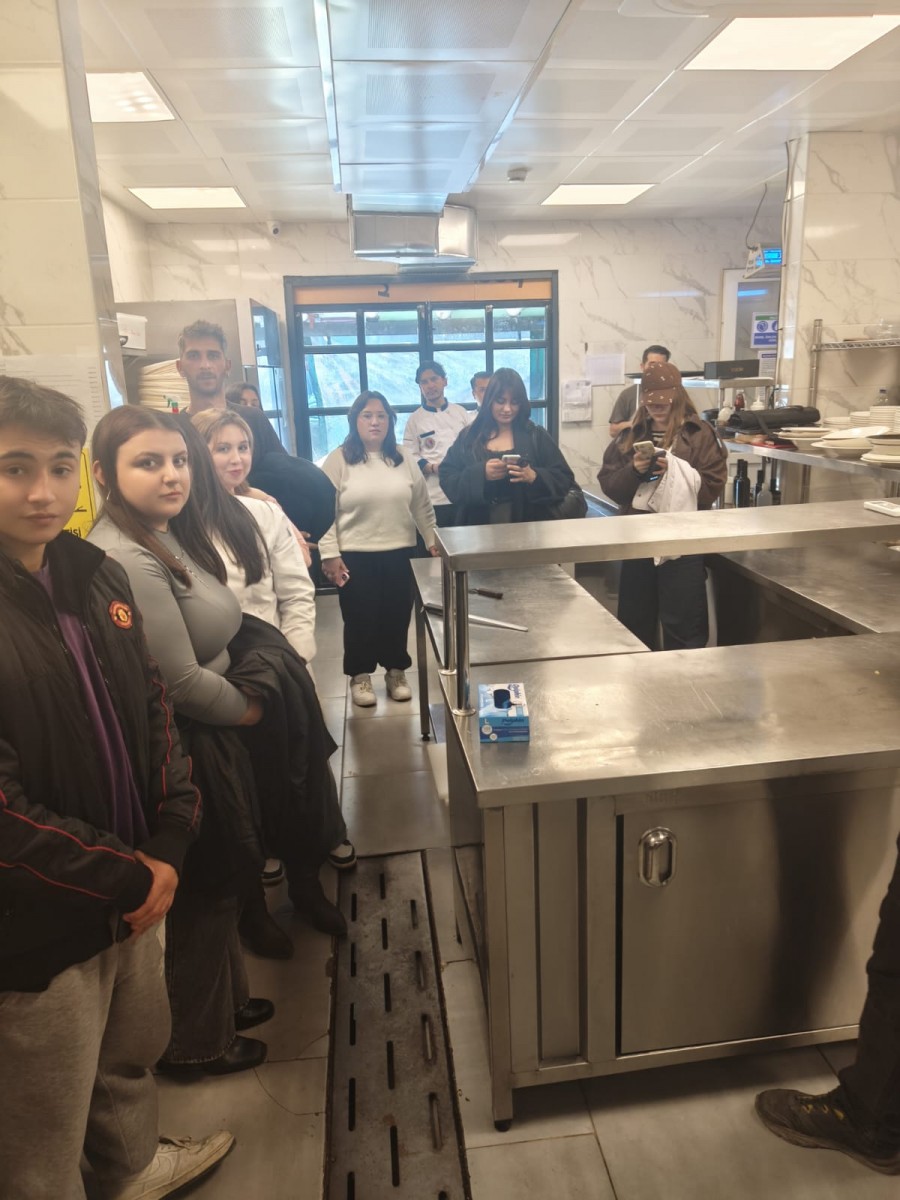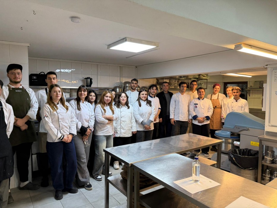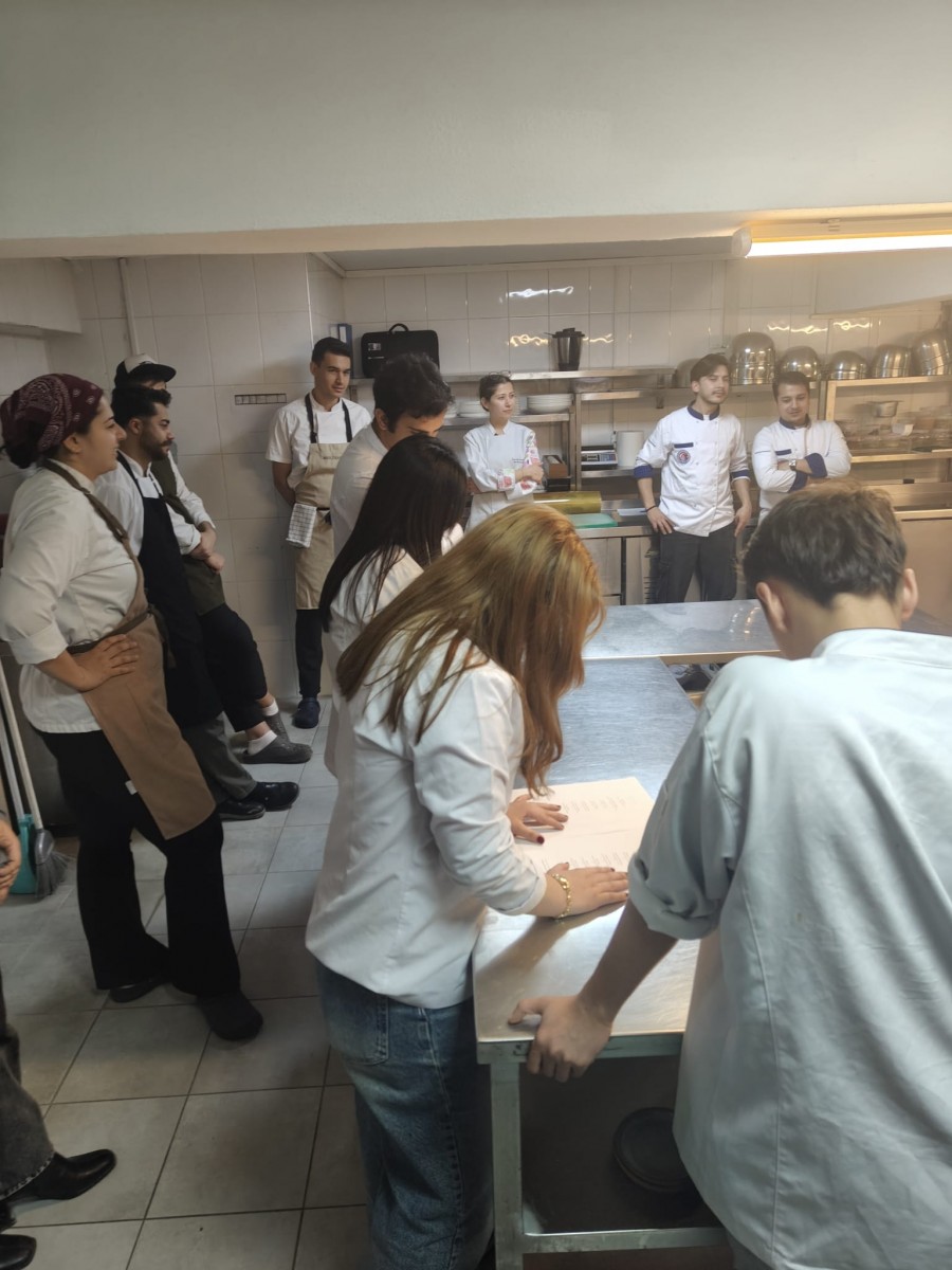 Teknik gezi kapsamında Manici Kasrı’nda gerçekleştirilen ziyarette, Şef Mehmet Ağaç Şahin, sous şef, pastisserie şefi ve sıcak mutfak şefi öğrencilerle tanışarak mutfak organizasyonu, üretim süreçleri ve uygulamalar hakkında bilgi paylaştı. Öğrenciler için özel olarak hazırlanan ikramlıklar sunulurken, her mutfak şefi kendi uzmanlık alanına ilişkin uygulamaları paylaşarak öğrencilerin sorularını yanıtladı. Mutfak alanları yerinde gezilerek üretim süreçleri uygulamalı olarak incelenme fırsatı buldu. Ayrıca Manici Kasrı’nın mimarisi, mutfak altyapısı ve işletme işleyişine ilişkin detaylı bilgilendirmeler yapıldı.