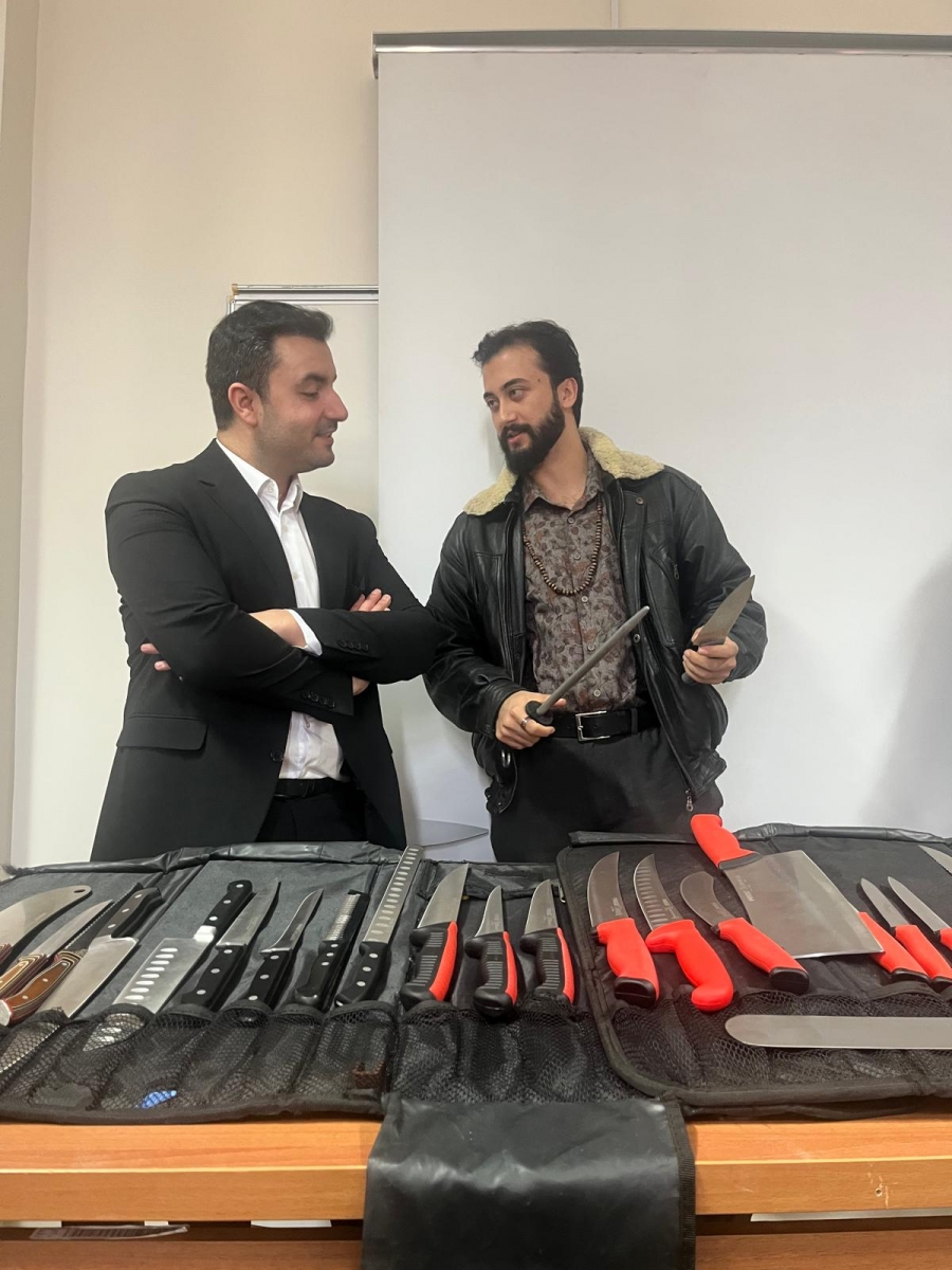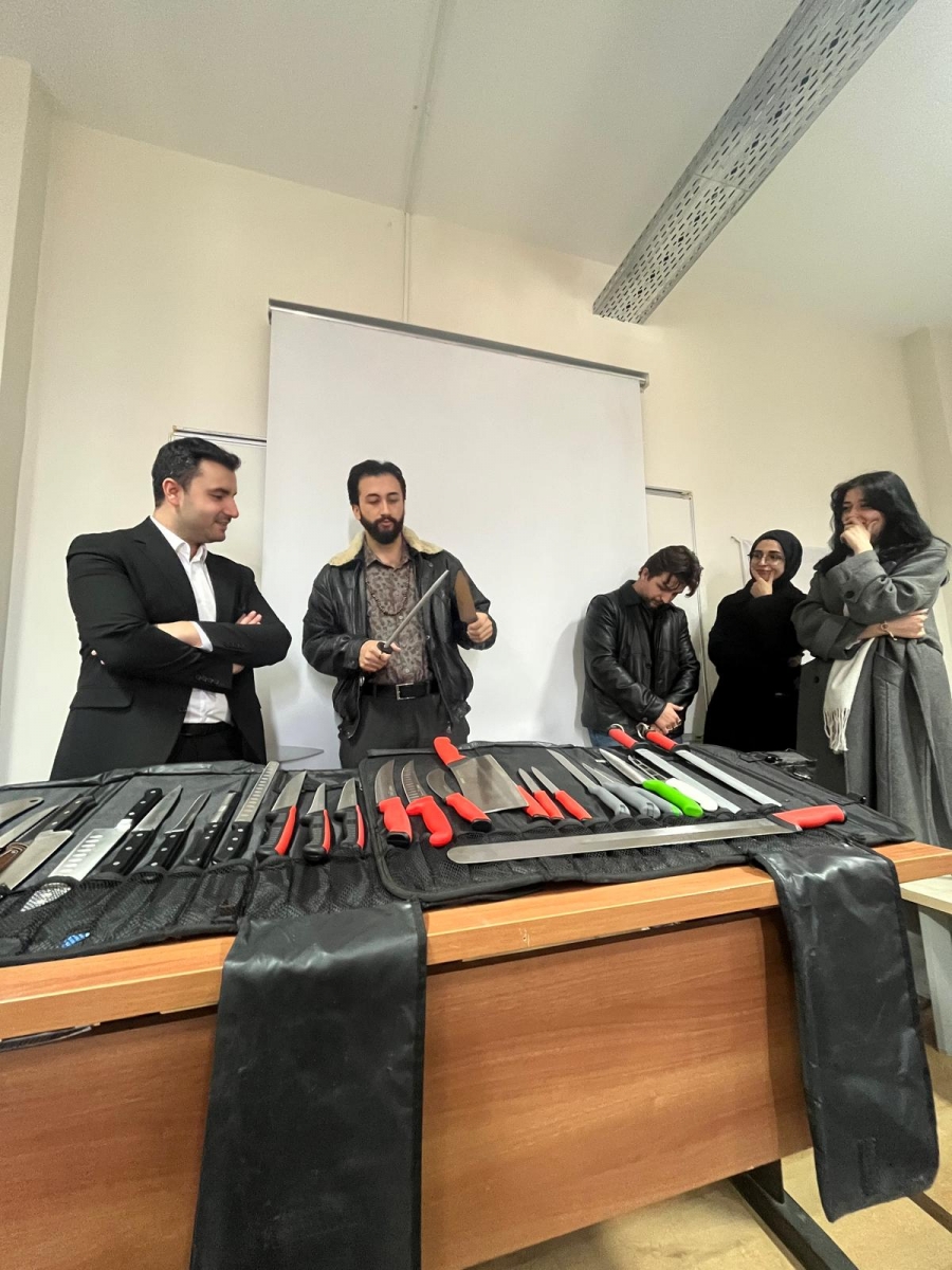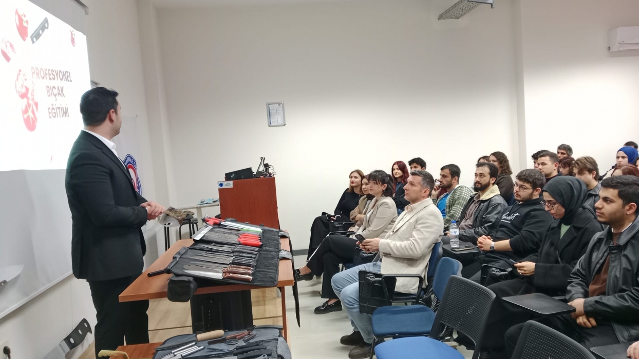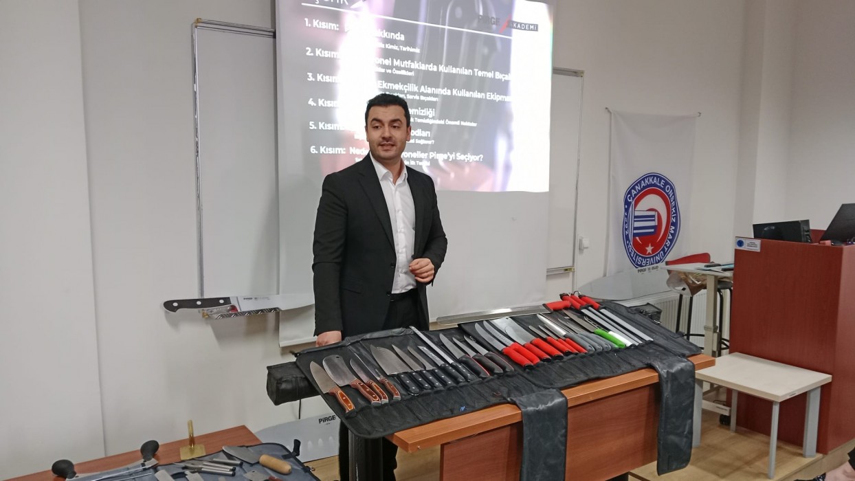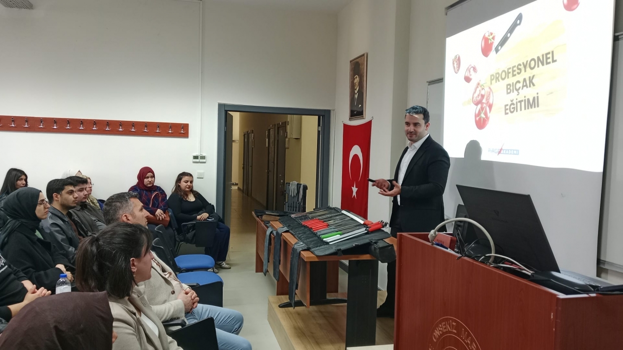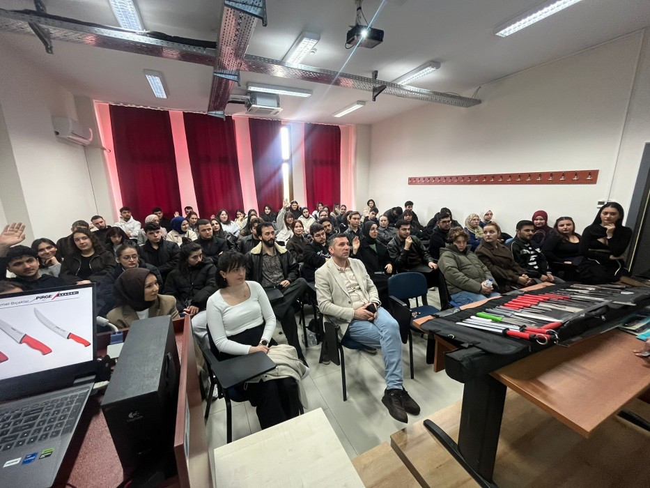 Gökçeada Uygulamalı Bilimler Yüksekokulu Gastronomi ve Mutfak Sanatları Bölümü öğrencilerine yönelik olarak PİRGE Akademi tarafından düzenlenen “Profesyonel Bıçak Eğitimi”, bugün Yüksekokul Seminer Salonu’nda gerçekleştirildi. Etkinlik, Gastronomi ve Mutfak Sanatları Bölüm Başkanı Öğr. Gör. Özkan Yazar koordinasyonunda düzenlendi.