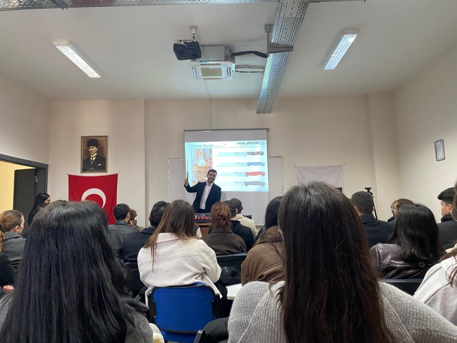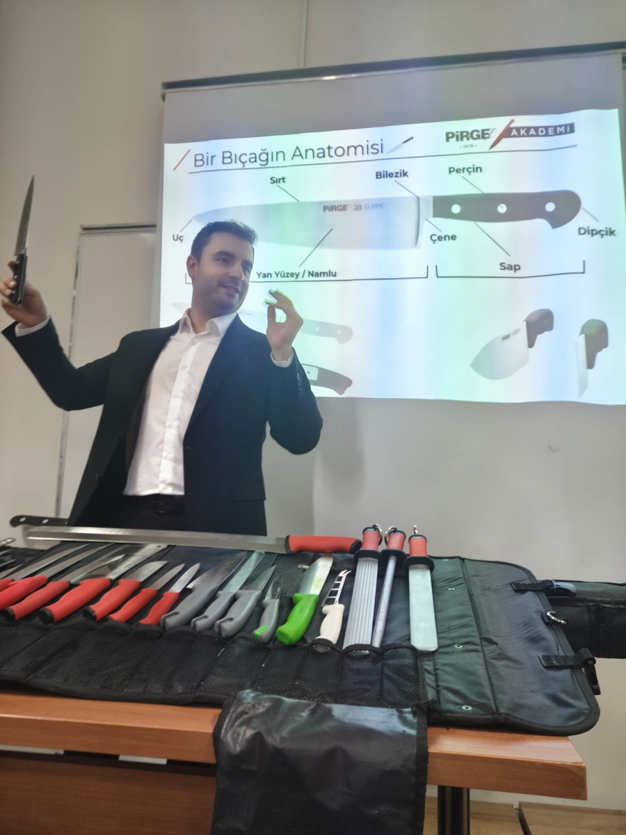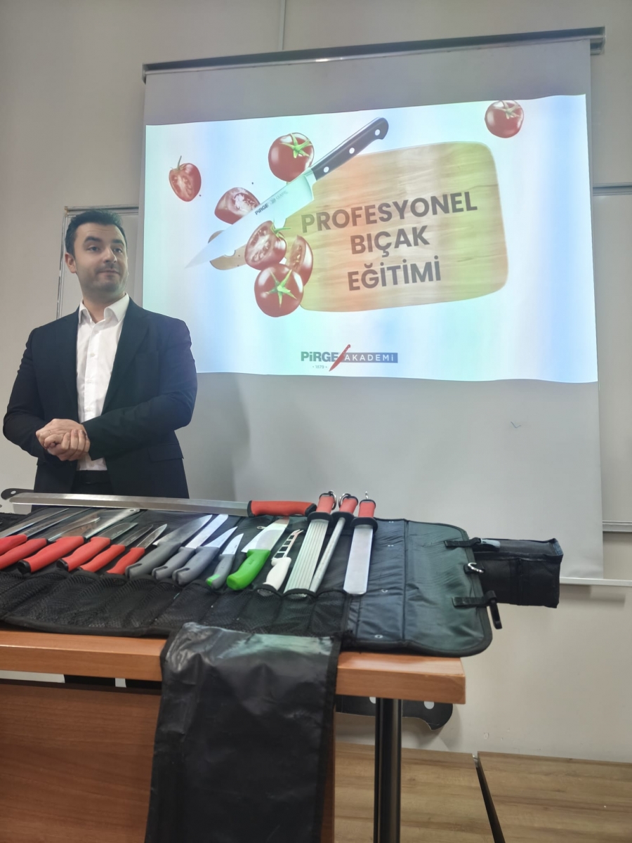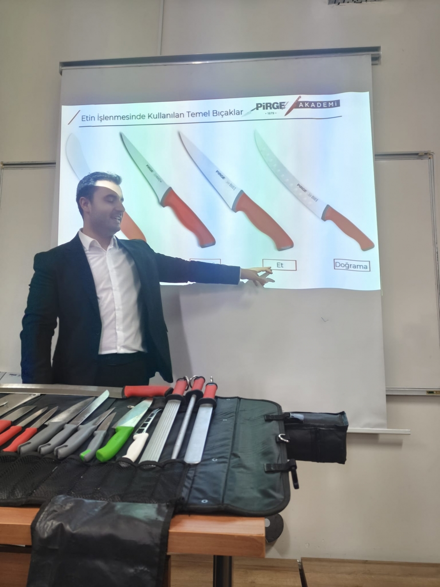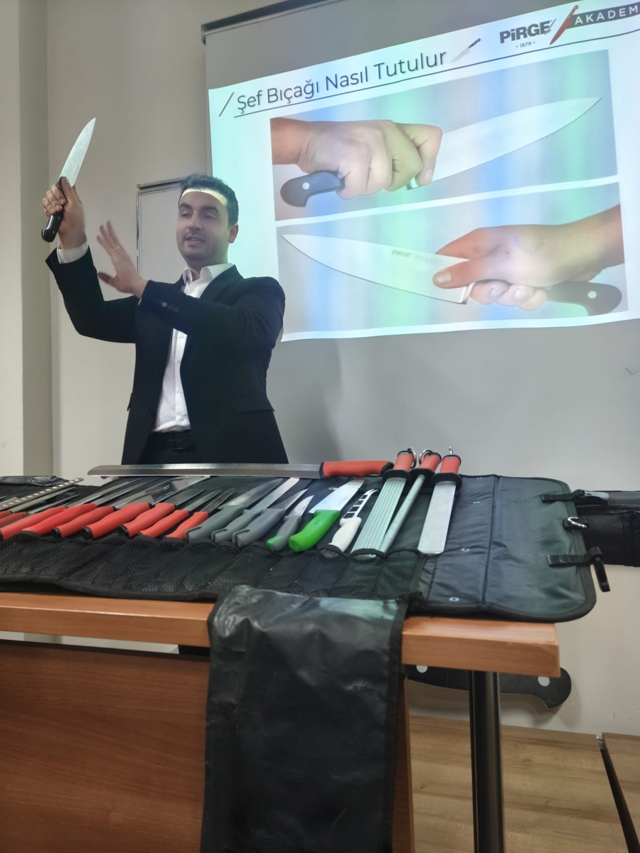 PİRGE Akademi Kurumsal Eğitim Uzmanı Fırat Erbil’in sunumuyla gerçekleştirilen eğitimde, öğrencilere mutfakta profesyonel bıçak kullanımıyla ilgili bilgilendirmeler yapıldı. Eğitim kapsamında doğru bıçak seçimi, bıçak türlerinin kullanım amaçları, kesim teknikleri ve iş güvenliği konuları ele alındı.